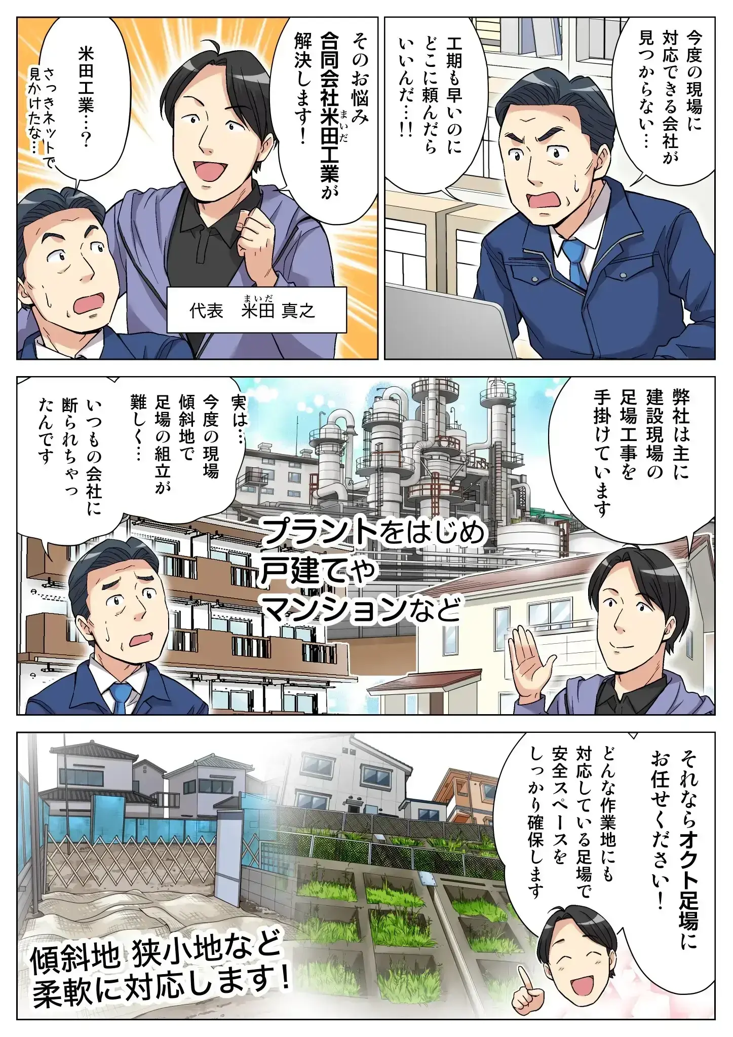 米田工業では自社素材を保有しているため、様々な現場・物件に対応することが可能です。スピーディーかつ柔軟に施工いたします。弊社では、対応しているところが少ないオクト足場も保有しています。オクト足場の施工経験が豊富なので、安心してお任せいただけます。